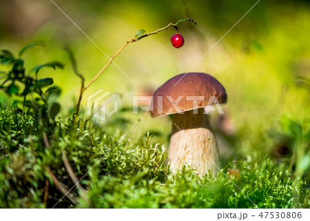 Beautiful Boletus edilus mushrooms in forest. White Boletus mushrooms in green moss.