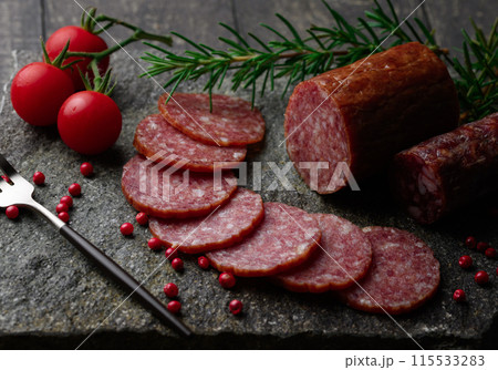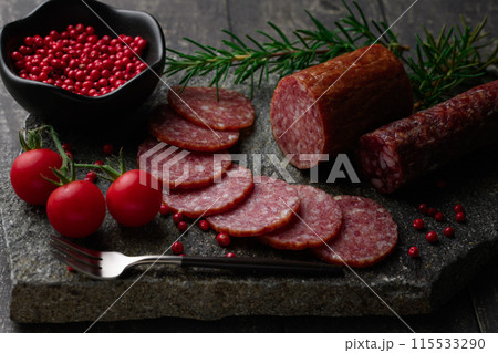カッティングボードの上にのせた熟成サラミ ピンクペッパーとローズマリーとプチトマト