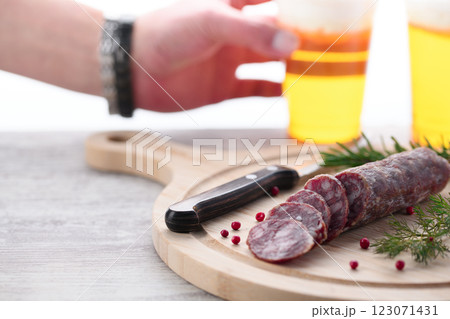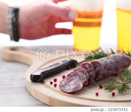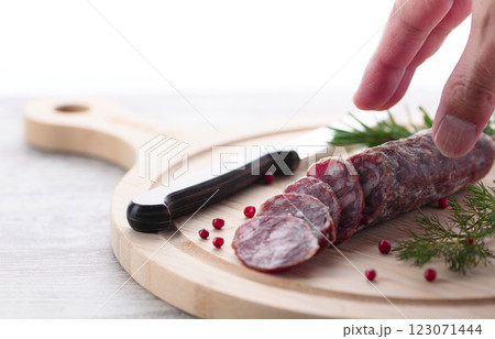 カッティングボードの上にのせた熟成サラミ ピンクペッパーとローズマリー