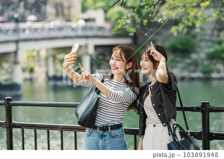 友達とスマホで自撮りする女性