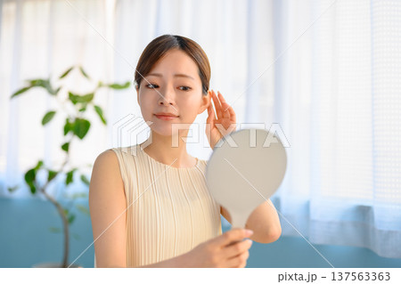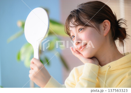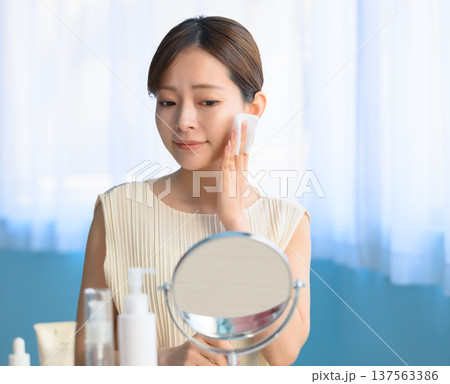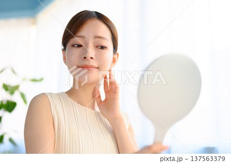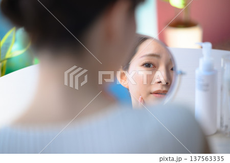 鏡を見てスキンケアをする女性 :はっぴぃぽっぷ