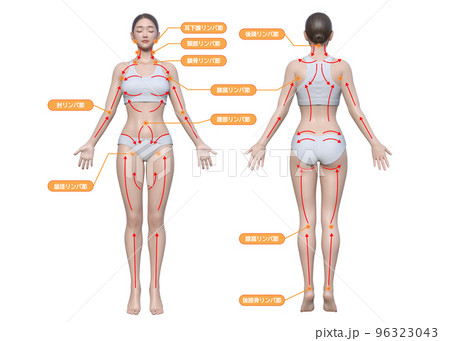 リンパの流れ マッサージ施術部位 ナチュラルな日本人3Dモデル女性の全身正面と後ろ姿のイラストセット