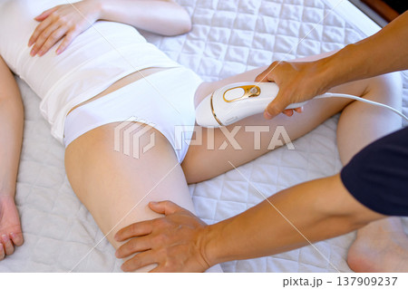 家庭用脱毛器を使うスレンダーな若い女性 脚の脱毛 スキンケア セルフ脱毛