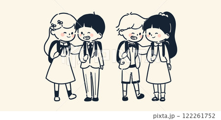 入学式にランドセルを背負って微笑み合う仲のいい女の子と男の子の友達のシンプルでかわいいイラスト