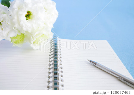 白いテーブルの上に置かれた白いブーケ ブライダル・ウェディングイメージ