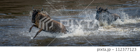 Panorama of two blue wildebeest in spray