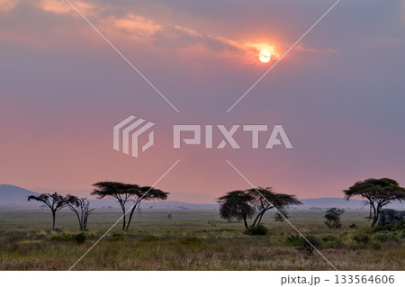 セレンゲティに沈む夕陽とアカシアのシルエット