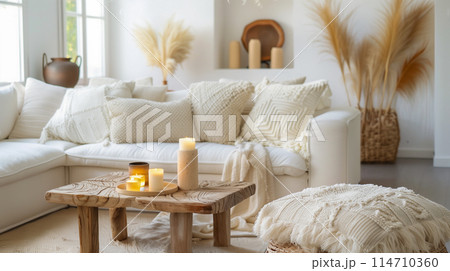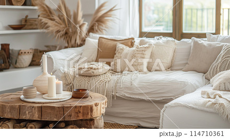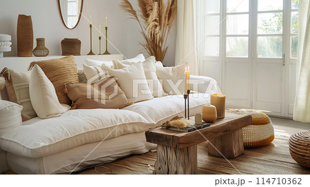 自然光が差し込む居心地の良いリビングルーム、ボーホーシックなデザイン