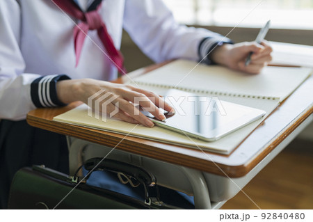 授業中にタブレット端末を使う女子高生