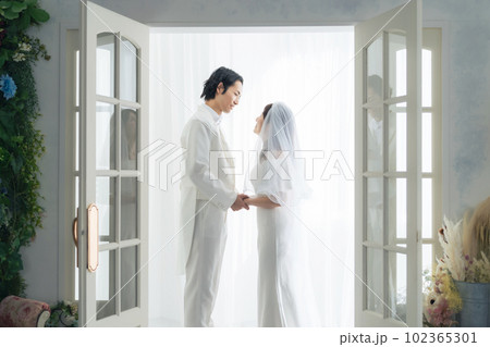 若い カップル 結婚式 ウェディング ドレス 花嫁 花婿 幸せ 祝う 人物 素材