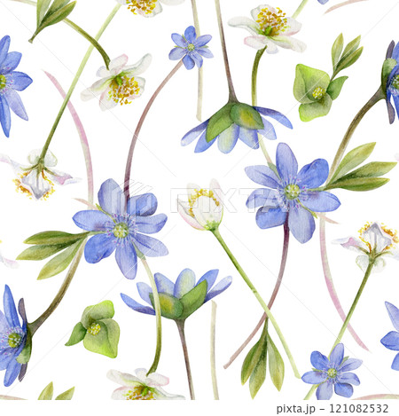 Spring ephemera flowers, blue hepatica forget-me-not flax, white forest anemone primrose bloodroot, grass, hand drawn in watercolor. Seamless pattern illustration for wedding, florist shop, stationery