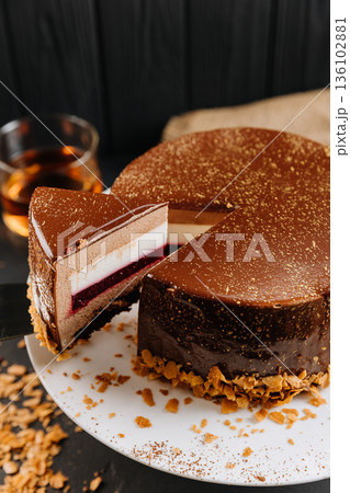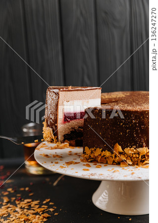 Layered chocolate mousse cake slice with raspberry jelly on spatula, dark background
