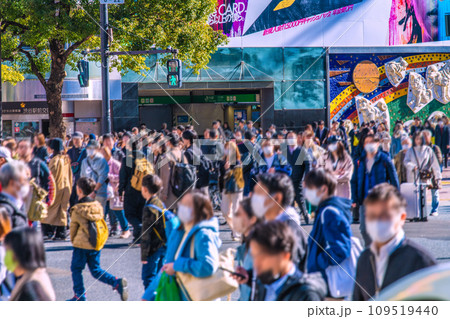 日本の東京都市景観 インフル予防に効果のないマ着増でコロナエアロゾル感染爆発再び誘発か=8日、渋谷