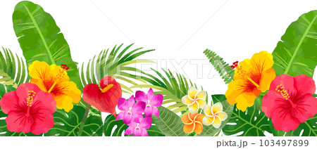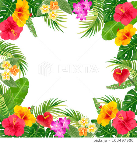トロピカルな南国の花と植物のフレームイラスト 手描き水彩
