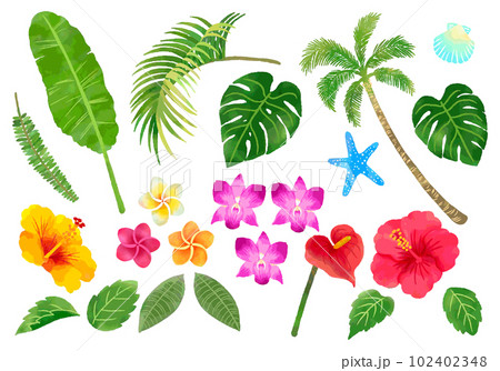 トロピカルな南国の花・植物 手描き水彩イラスト アイコンセット