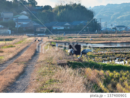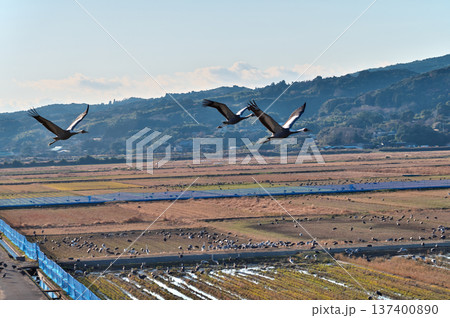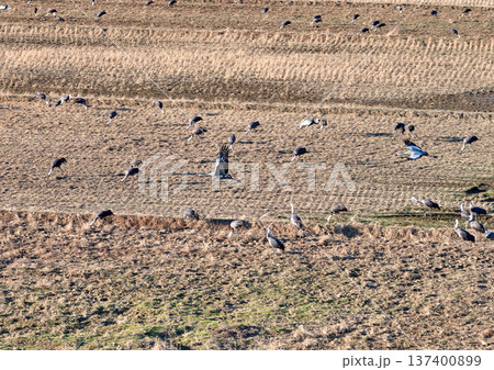 マナヅルと争うソデグロヅルの幼鳥(鹿児島県・出水市)