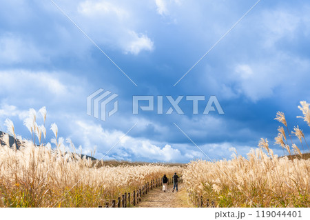 秋の曽爾高原 すすきの道を歩く中年カップル