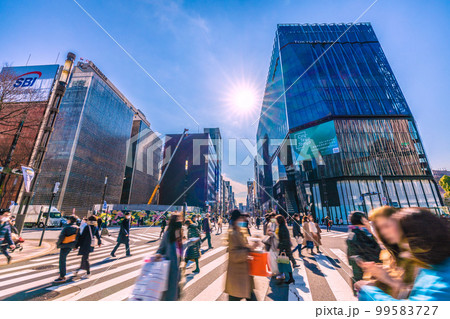 日本の東京都市景観 数寄屋橋交差点。マスク妄想の呪縛から解放なるか…屋外室内等マスク不要!=20日