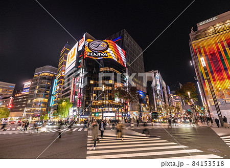 日本の東京都市景観 数寄屋橋の交差点から銀座を望む(夜景)