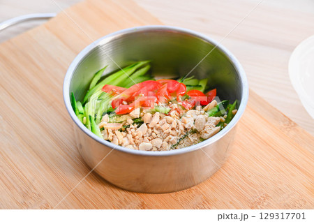 器にいれた胡瓜とトマトの細切りとピーナツ