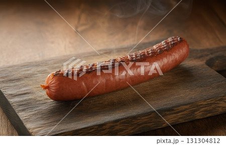 Perfectly grilled hot dog sausage steaming on a rustic wooden cutting board