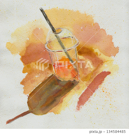 A glass with a drink in sand with a straw. Hand-drawn with watercolors on textured paper. For a postcard, travel, cover