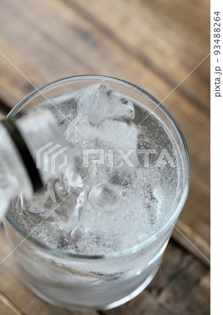 氷の入ったグラスではじける炭酸水の気泡