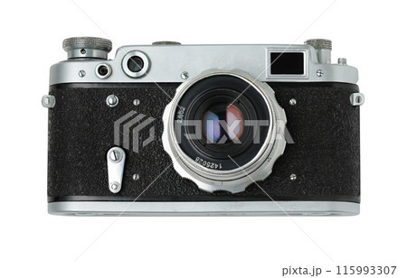 Old antique vintage black camera isolated on white background with cliping path. Russia.