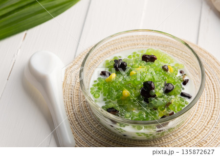 Pandan flavoured Black bean and corn Tapioca pearl pudding (Sago) with a dash of coconut milk