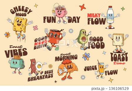 Funky breakfast food and drink y2k groovy stickers with vector slogans. Cheesy mood, fun day, milky flow, toast vibes. Good mood brew, good food, sweet morning. Toast time, best breakfast, juice flow