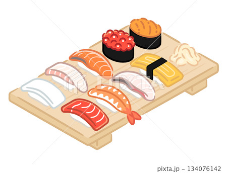 Premium realistic hand-drawn watercolor illustration set of traditional Japanese Nigiri sushi. Featuring foie gras, egg omelet, saltwater eel, red sea bream and mackerel on rice. Transparency