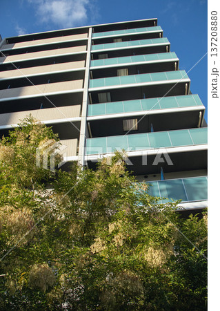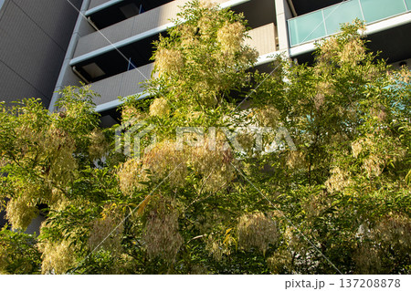 黄色になったシマトネリコと集合住宅のビル