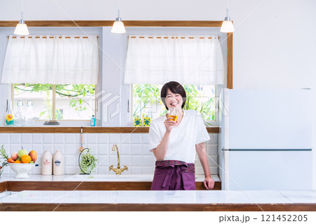 キッチンでグラスを持った笑顔の女性