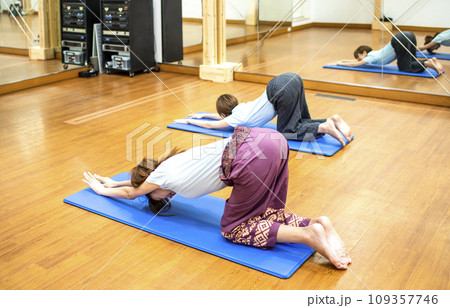 若い女性のヨガイメージ 説明をするトレーナーと説明を聞く若い女性