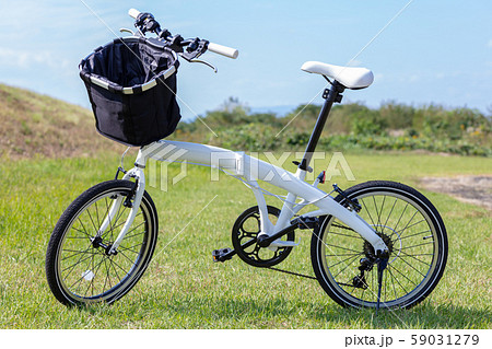 白い折りたたみ自転車と前かご_自転車のみ・無人・人無し_サイクリング・買い物