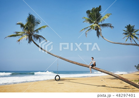 Beautiful handsome young athlete dressed in black t-shirt. During this time, sitting on the tires