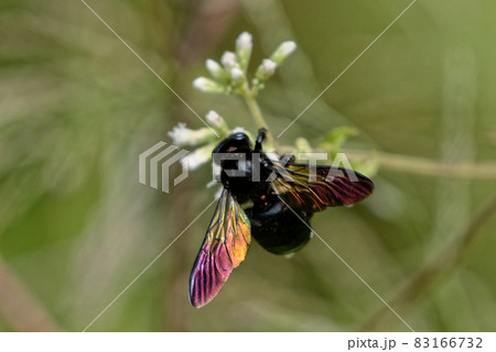 虹色に輝く羽根がきれいなタイワンタケクマバチ