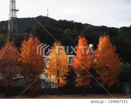 冬の日差しを浴びたタイワンフウの樹々(烏帽子山と電波塔と紅葉した神田公園のカエデ)