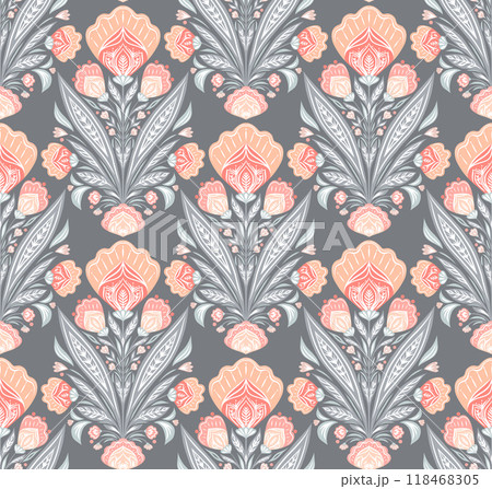 Vector decorative folk art seamless ornament in delicate colors on gray background. Flat tracery pattern with pink flowers and foliage bouquets