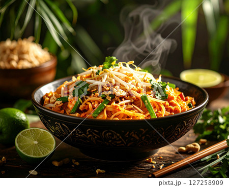 AI generated authentic Thai pad thai stir-fried noodles served in ornate ceramic bowl and fresh ingredients like bean sprouts, peanuts and lime, steaming hot with visible wok hei aroma