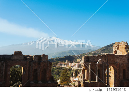 イタリア 地中海 シチリア島 タオルミーナ ギリシャ劇場前からタウロ山を望む