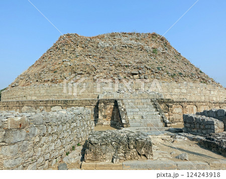 パキスタンのタキシラにある紀元前後の都市遺跡シルカップ遺跡に残る双頭の鷲の塑像彫刻が残る仏塔跡