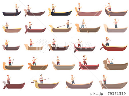 Gondolier icons set cartoon vector. Venice bridge gondola