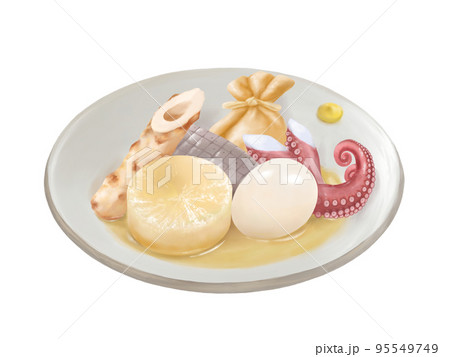 皿に盛られたおでんの具のリアルな水彩イラスト