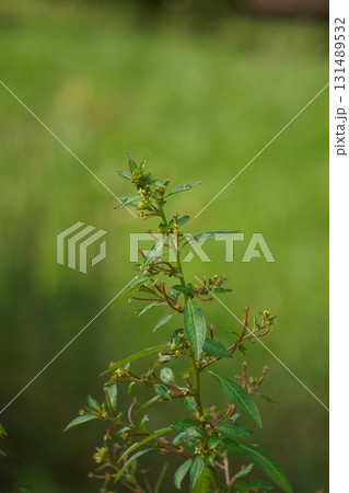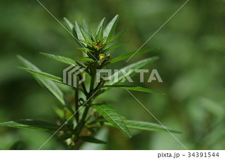 自然 植物 チョウジタデ、良く茂った葉の間にまばらに黄色い花。花弁は四枚か五枚だそうです