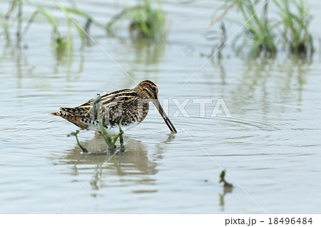 沼地で採食するタシギ