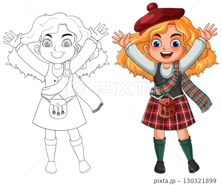 Smiling Girl in Traditional Scottish Highland Dress with Arms Raised