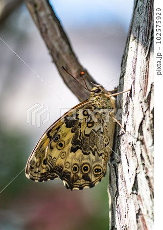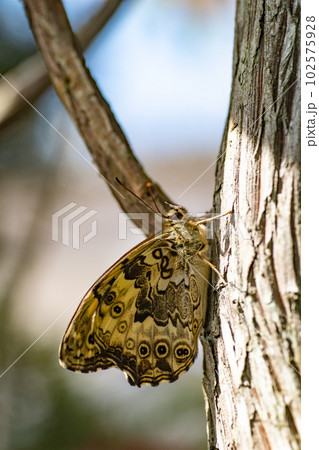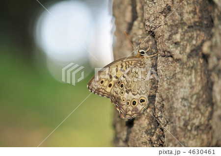 ブナ科コナラの幹に止まるタテハチョウ科サトキマダラヒカゲ