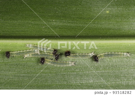 ススキの葉に黒い角頭に黄緑色のクロコノマチョウの幼虫(自然光+ストロボ、マクロ接写撮影)