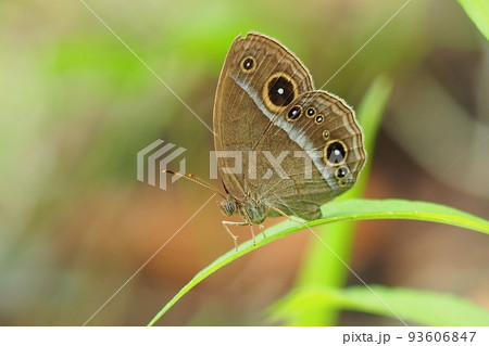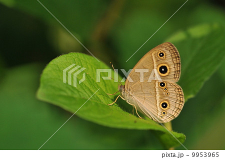 緑の葉に止まるタテハチョウ科オオヒカゲ♀